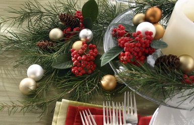 Φυσικά κλαδιά ελάτου με κουκουνάρια, λίγες μπαλίτσες σε χρυσό και ασημί χρώμα, κεριά και κατακόκκινους καρπούς ίλεξ με φόντο μια γυάλινη επιφάνεια ( μια πιατέλα με πόδι ή και ένα βαθύ βάζο ) δημιουργούν μια άψογη αισθητική αντίθεση χρωμάτων και σχεδίων για μια πολύ απλή και εναλλακτική διακόσμηση.
