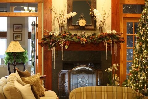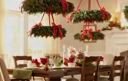 Κόκκινες κορδέλες από οργαντίνα ή σατέν σε καταπράσινα στεφάνια ελάτου πλαισιώνουν τέλεια ένα μεσημεριανό γεύμα στην τραπεζαρία ενός ορεινού ξενοδοχείου, περιβάλλον χαρούμενο και γιορτινό με χλιδή και απλότητα ταυτόχρονα.