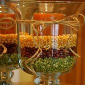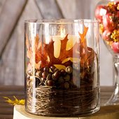Το γυαλί είναι ένα υλικό που συνδυάζεται ποικιλοτρόπως, επαναχρησιμοποιείται αρκετές φορές και αποδίδει σχεδόν πάντα ένα τέλειο αποτέλεσμα. Φύλλα δέντρων αποξηραμένα, κουκουνάρες, χρωματιστή άμμος, κεριά και μερικά ξερά κλαδιά λυγαριάς τοποθετημένα σε διαφορετικού μεγέθους γυάλινα δοχεία συνθέτουν χρωματικά το απόλυτο φθινοπωρινό τοπίο, αποπνέοντας άρωμα εποχής με απλό και πολύ οικονομικό τρόπο.